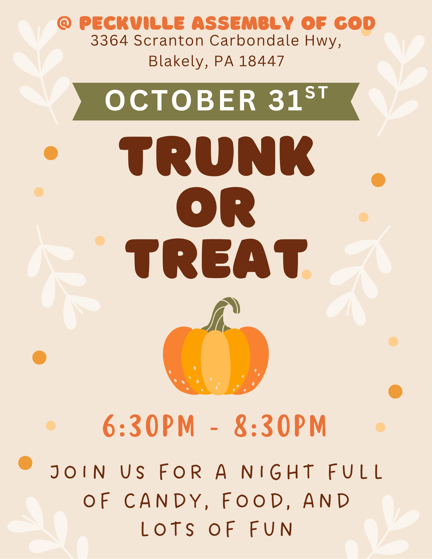 If you would like to donate candy for the trunk or treat, you can drop it off in the donation basket in the lobby at Peckville Assembly of God. If you would like to serve at the trunk or treat or set up and decorate your car, please scan click the button below to sign up now!